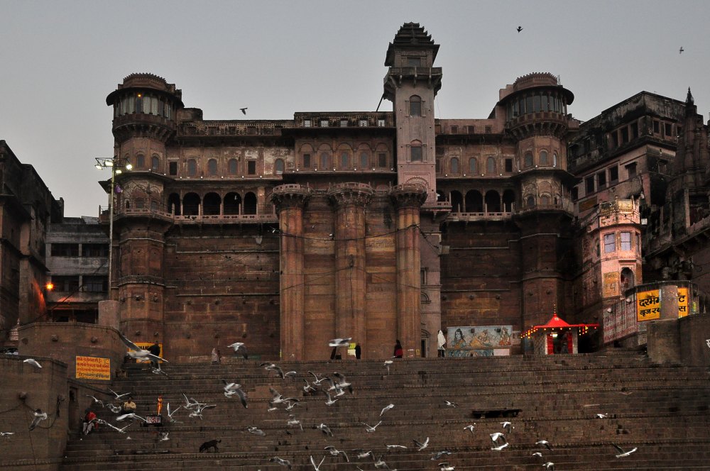 Cette haveli date du début du XXe siècle. Le donjon et les tourelles dominent le Darbhanga Ghât.