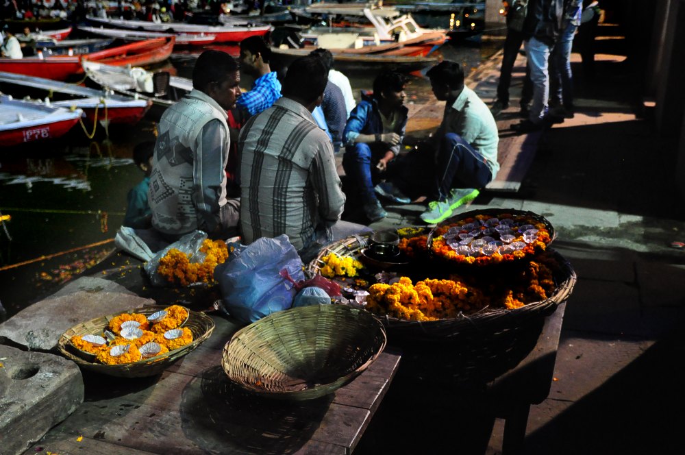 Partout des vendeurs de fleurs et de bougies flottantes qui serviront d’offrande à Ganga, la déesse Gange.