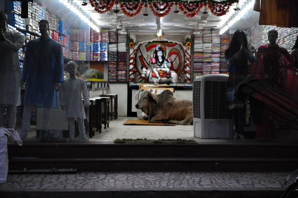 Le propriétaire du magasin a vu en rêve son père réincarné dans ce taureau. Depuis, il vit là…