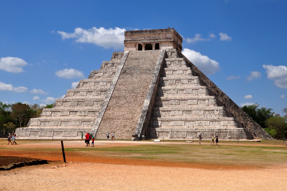 Deux têtes de serpent encadrent la base de l’escalier principal qui mène au temple. Au moment des équinoxes, le soleil produit sur les arêtes de la pyramide deux ombres portées qui donnent l’impression que les corps des serpents ondulent. C’est pour cette raison que le Castillo, nom donné par les Espagnols, est appelé Kukulcán (serpent à plumes) par les Indiens.