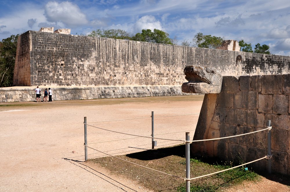 Un contrefort protégeait la base des murs. Une rampe, ayant la forme d’un corps de serpent parcourait toute sa longueur pour se terminer par la tête de Kukulcán, le serpent à plumes des Mayas, à moins que ce ne soit Quetzalcoatl, le serpent à plumes des Toltèques. A Chichen Itzà on n’est jamais sûr.