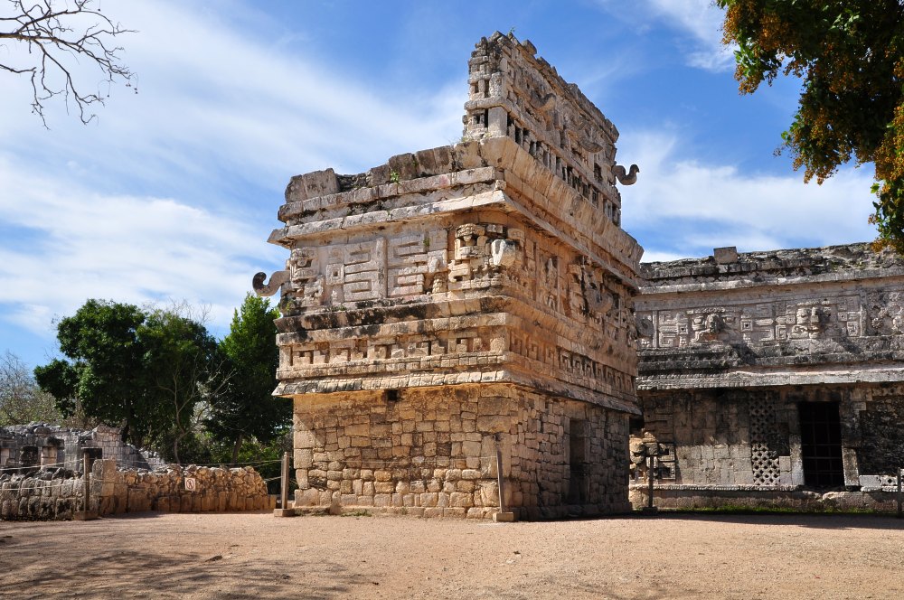 La Iglesia est un petit temple dans le style maya classique avec, aux coins, des représentations de Chaac, le dieu de la pluie dont le long nez ressemble à un crochet.
