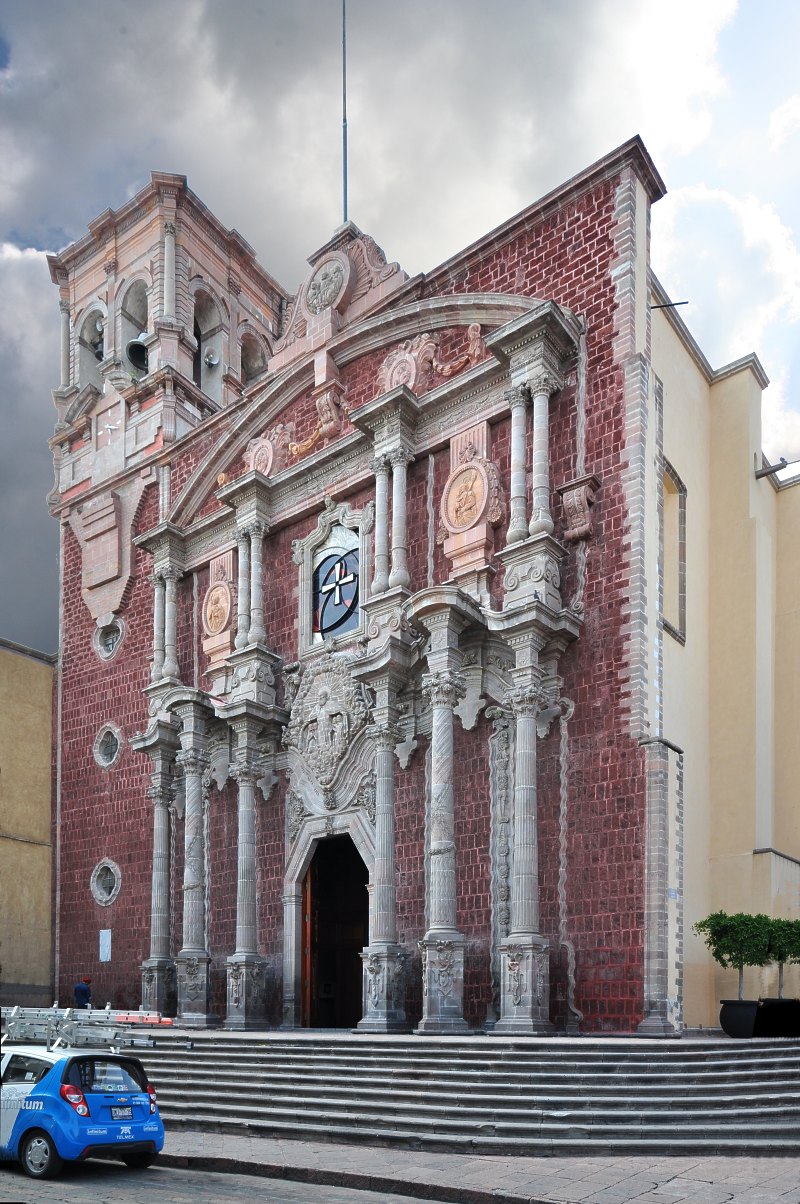 La Cathédrale de Querétaro et sa façade baroque de pierres roses. Sa construction date du début du XIXème siècle.