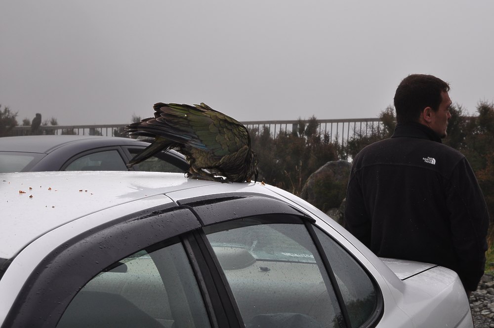 Le bec du kea est un instrument redoutable. Aucun joint, même le mieux protégé, ne lui résiste. En plus, le kea travaille en équipe. Un ou deux individus font le cirque devant vous et, pendant ce temps-là, un troisième s’attaque à votre voiture ou vous vole vos affaires. Pour cette raison on les nomme «les clowns des montagnes» et, en anglais, où les noms collectifs sont spécifiques à chaque espèce animale (school of fish - troop of monkeys) on dit un «circus of kea».