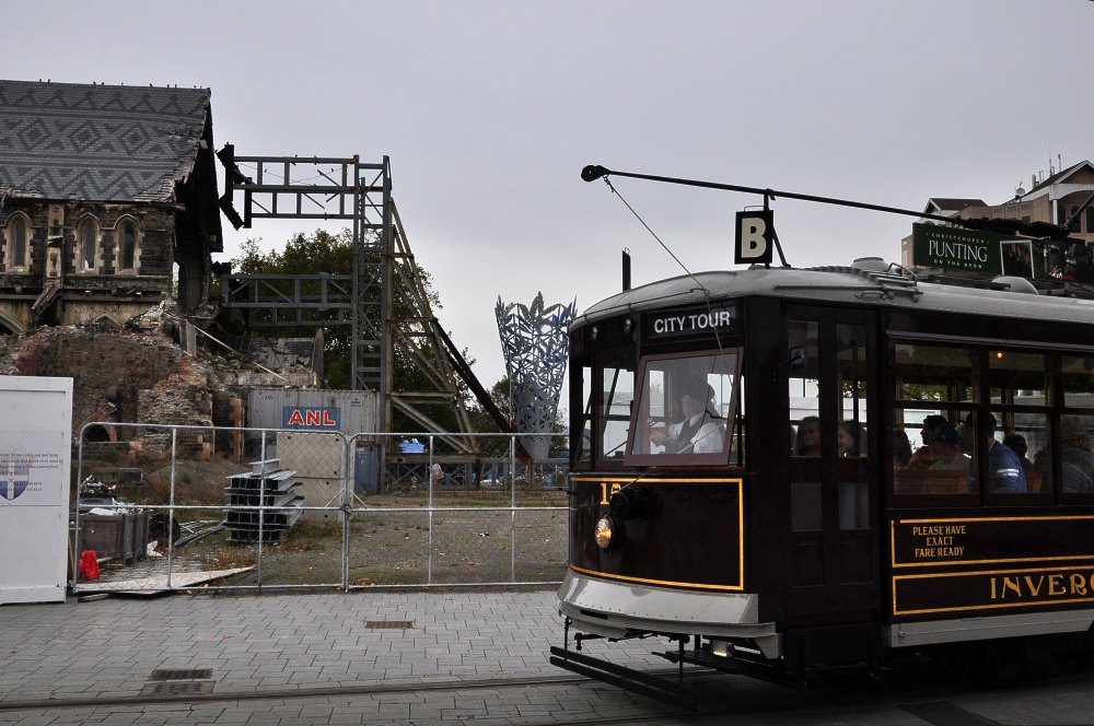 Tramway tout neuf passant devant les ruines de la cathédrale.