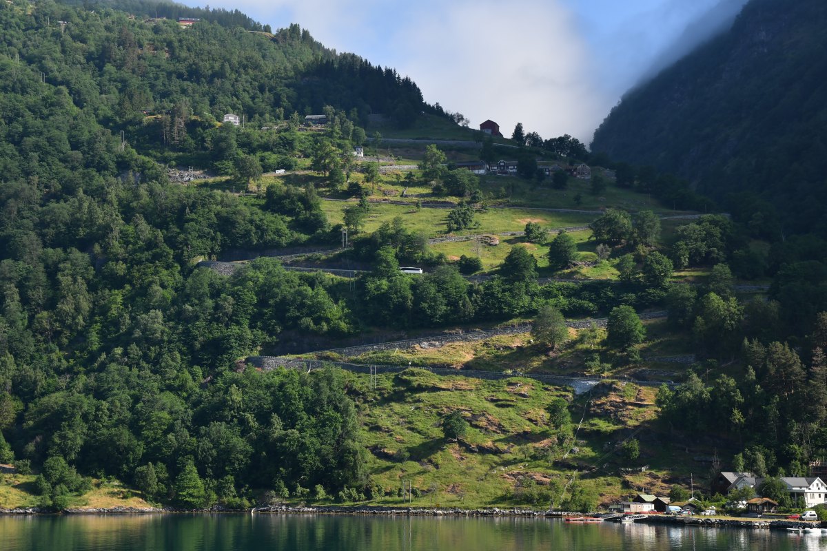 On aperçoit la route des Aigles qui grimpe de 620m en 8km. Construite en 1952, elle offre un accès plus direct à Alesund.
