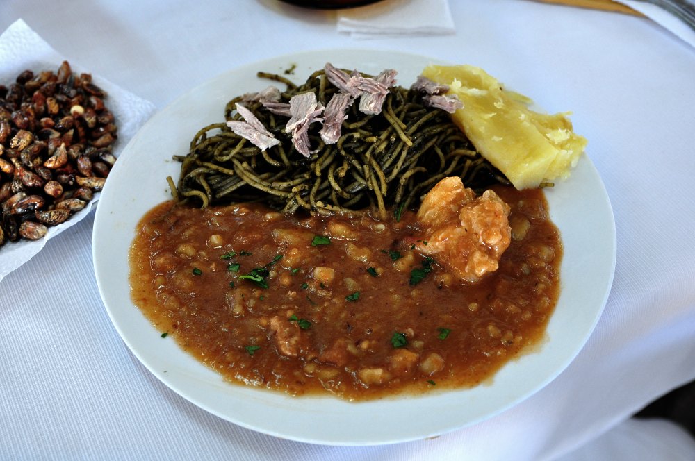 Manchapecho, le tache poitrine : mélange de porc, poulet, pommes de terre déshydratées avec une sauce cannelle, chocolat, piment et pâte d’ail. Spaghetti et manioc.