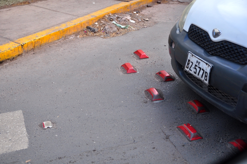 Bien sûr, il y a des limites de vitesse. Elles sont indiquées sur les panneaux de bord de route. Pour le reste il y a les topes. Ces plots métalliques placés en quinconce sont des tueurs. Vous devez vous arrêter pour les passer au pas sans y laisser vos pneus et vos jantes.