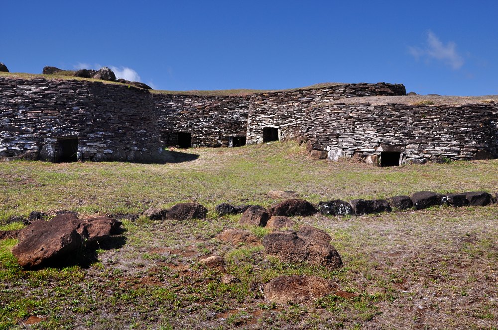 Un moai excepcional estaba incorporado en el muro de una casa en el sector central de la aldea. El cuerpo y la cara estaban pintados con tierra blanca, y los diseños destacados con tierra roja. Fue sacado en 1868 por la tripulación del barco de