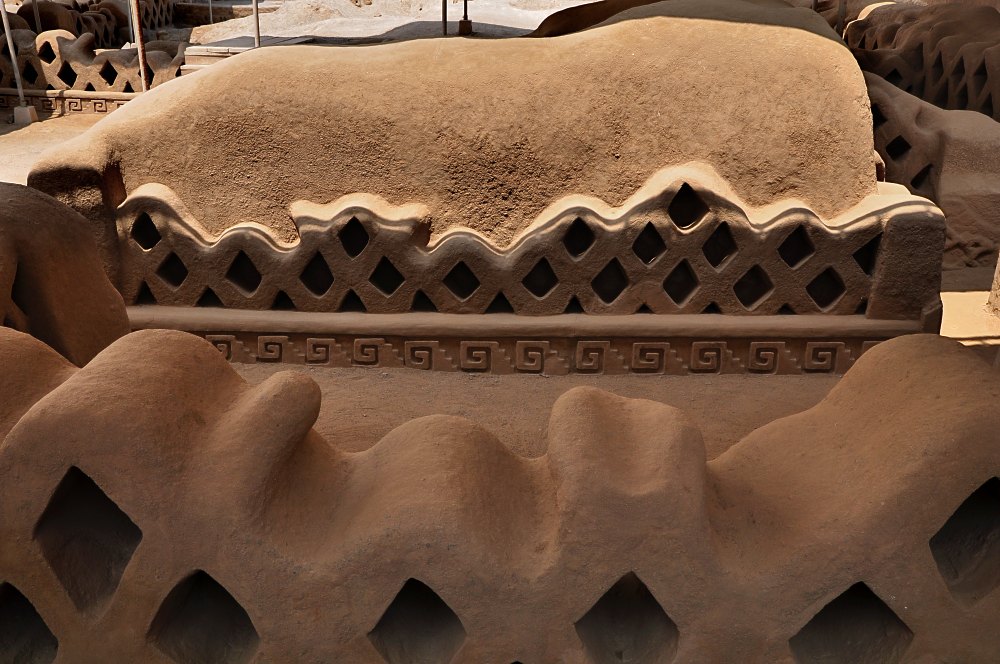 Les murs à claire-voie sont omniprésents à Chan Chan. Ils permettaient de filtrer la lumière tout en bloquant la chaleur. Aucun n’est aujourd’hui intact. El Niño en a dissout la partie supérieure.