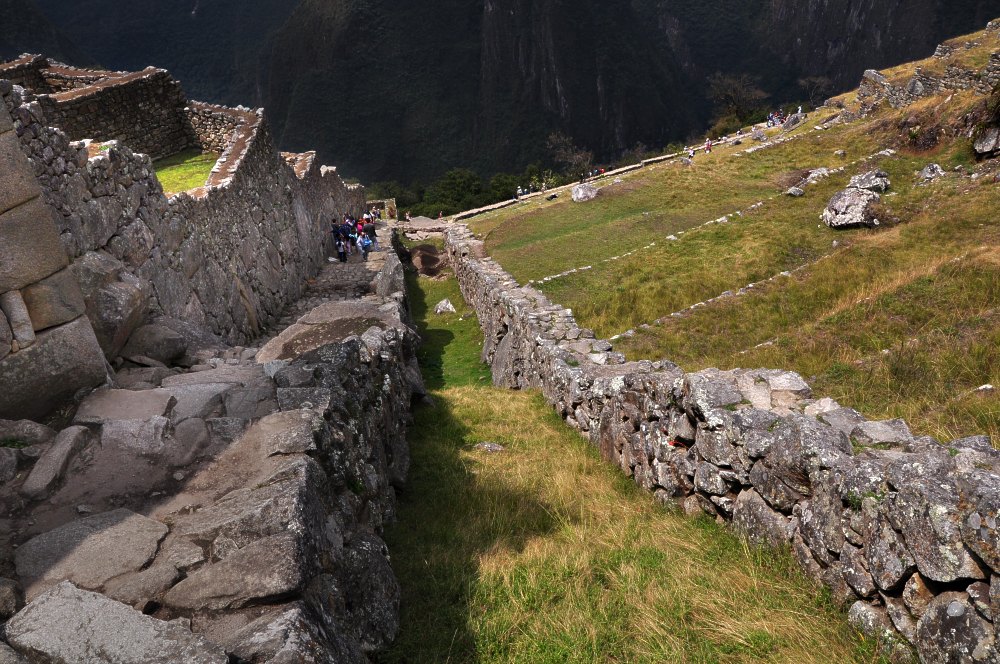 Le site de Machu Picchu est coupé en son milieu par un long mur flanqué d’un escalier qui sépare la zone urbaine des zones agricoles. Un profond fossé suit le mur et l’escalier. On a tout d’abord pensé qu’il s’agissait d’un drainage jusqu’à ce que des études géologiques révèlent que le fossé suit, en fait, une faille naturelle du piton. Les Incas ont donc laissé entre les deux parties de leur cité un énorme "joint de dilatation" en cas de tremblement de terre.