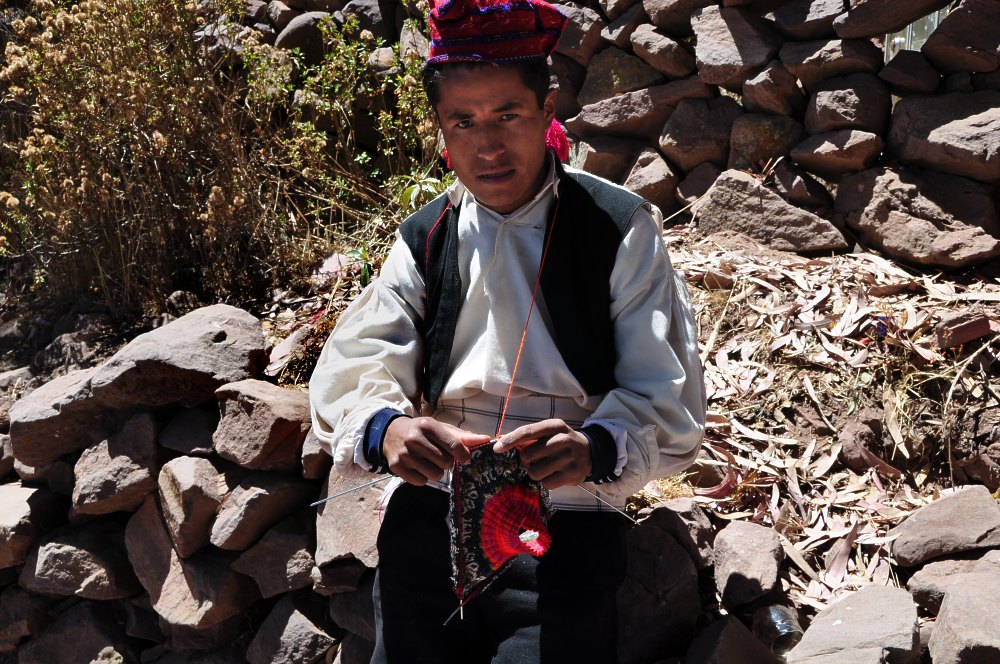Taquileño en train de tricoter. Selon vous, marié ou célibataire ?