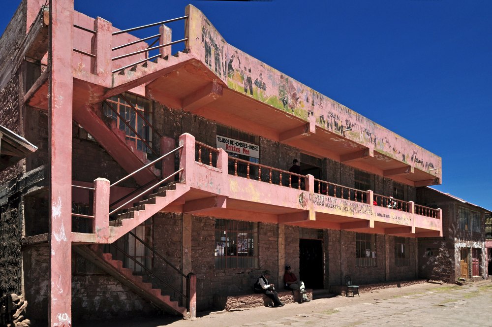 La maison de la coopérative. Tous les tissus et lainages fabriqués sur l’île sont vendus ici. Les prix sont fixés par le conseil et ne sont pas marchandables. Toutes les pièces du même genre sont au même prix. Le rapport des ventes est distribué à parts égales aux membres de la communauté.