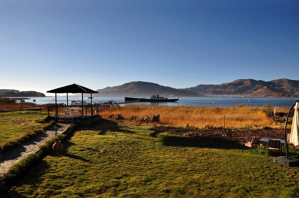 Vue du lac, aux environs de la ville de Puno. Un navire fluvial anglais qui opérait sur la Tamise a été remonté ici, dans les années 1920, pour servir sur le lac. Il héberge maintenant un petit musée.
