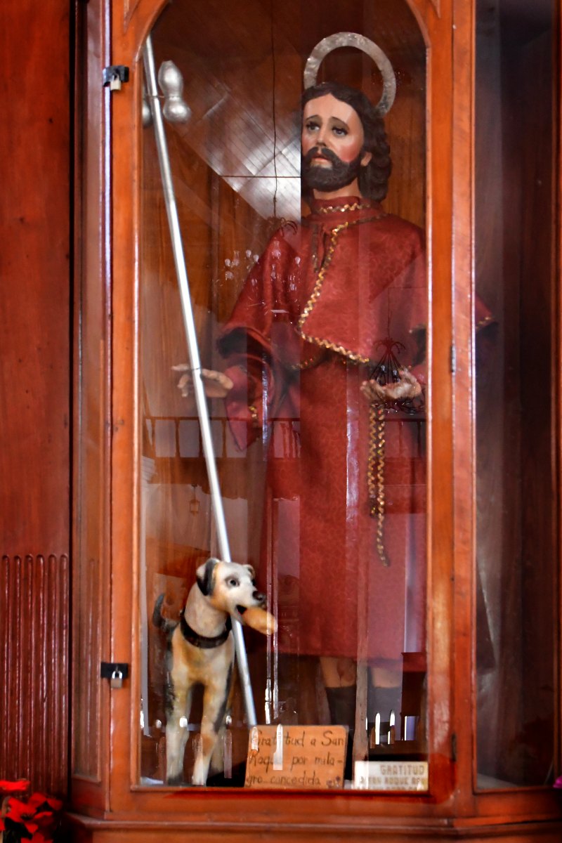 Mais c'est dans une vitrine fermée que nous découvrons Saint Roch, connu ici sous le nom de San Roque, en compagnie de son petit chien, son roquet.