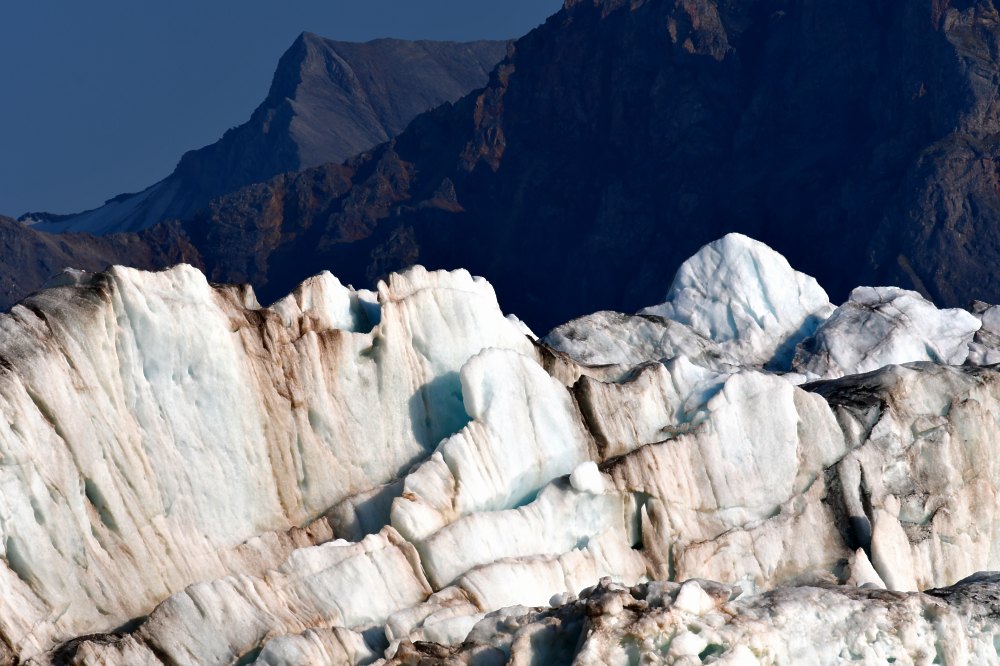 Plus haut dans les glaciers, la pression gigantesque entraîne les glaces du fond vers le haut. Elles ramènent alors dans leur remontée des traces de sédiments qui donnent ces marbrures marron à la glace.