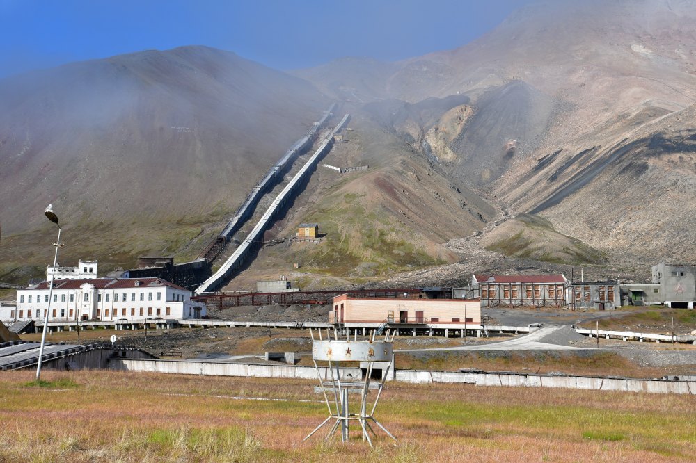 Le funiculaire, sur le flanc de la montagne avec à sa base, le bâtiment d'administration de la mine. Vestiges de l’époque minière où les hommes tractaient les wagons dans les entrailles de la terre, les traînées noires du charbon se mêlent au couleurs vives de la roche et de la mousse. .