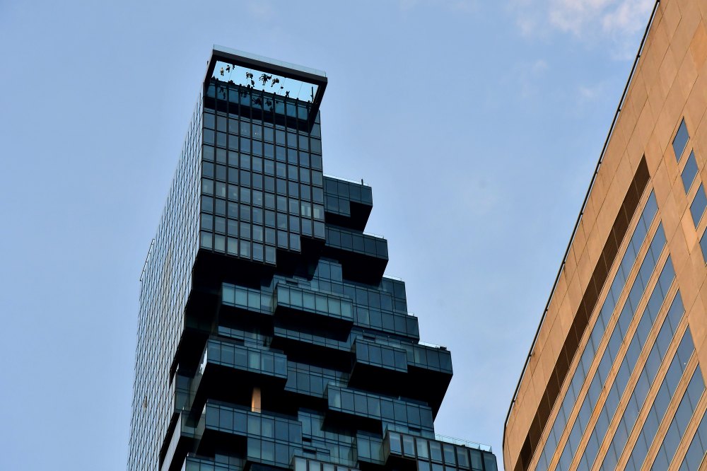 En haut de la tour, une terrasse de verre suspendue dans le vide, permet d'admirer la Cité des Anges. On aperçoit ici les touristes qui marchent dessus.