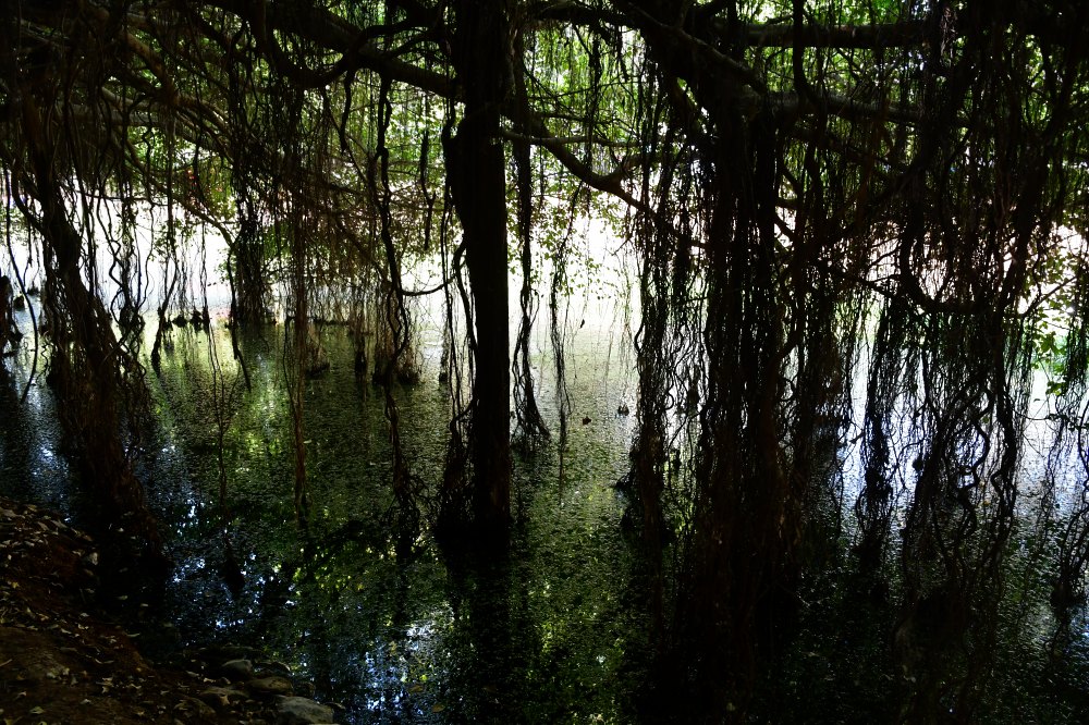 Le banian a prospéré grâce à sa situation, sur un îlot. Certaines de ses racines plongent directement dans l'étang.