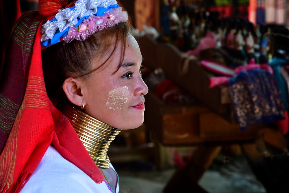 D'origine birmane, les femmes Kayan continuent à protéger leur peau avec une pâte argileuse de couleur crème.