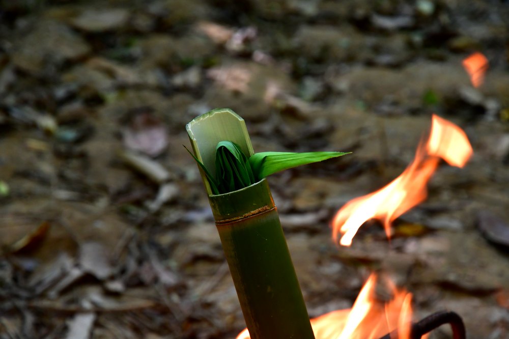Même dans ce climat humide, il faut boire beaucoup : on fait bouillir de l'eau dans des bambous évidés.