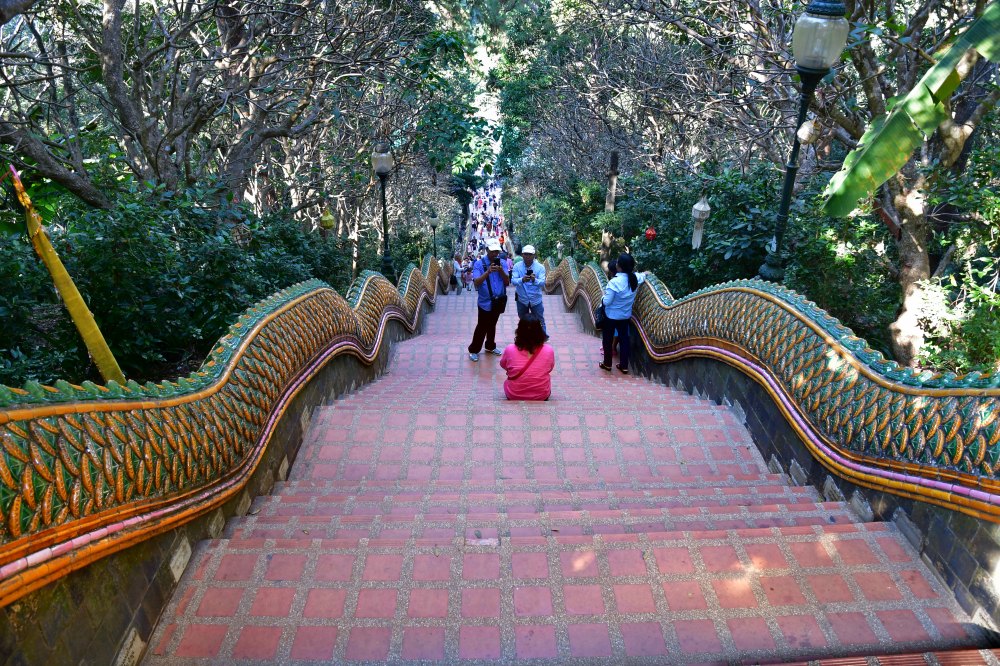 Le corps d'un naga couvert d'écailles de céramique sert de rambarde.
