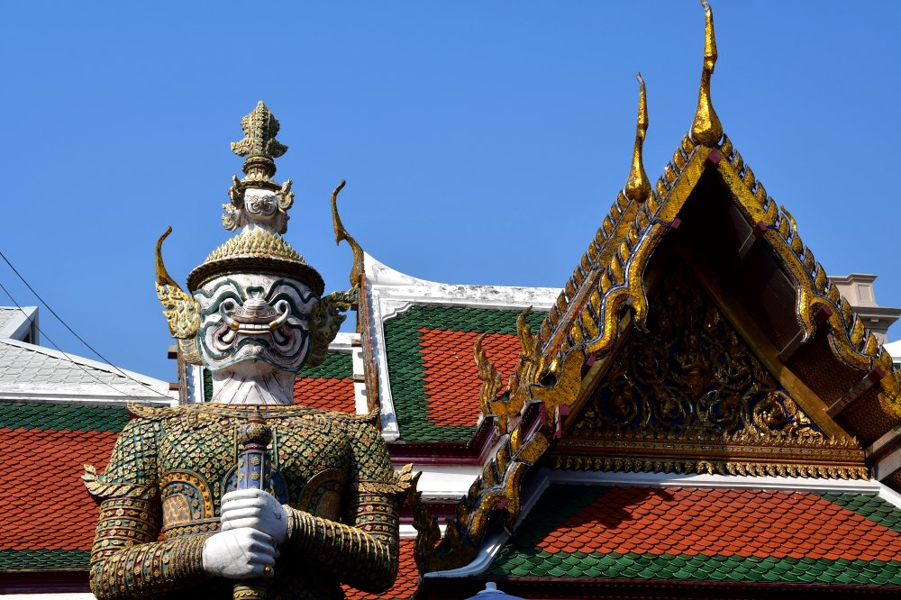 Deux Yaksha, démons du Ramakien, gardent la galerie. Ils sont là pour protéger le Bouddha d'émeraude des mauvais esprits.