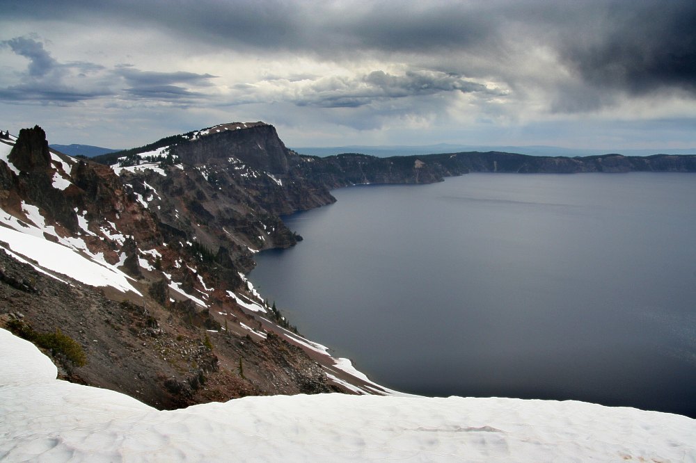 Crater Lake en juin. C'est le neuvième lac le plus profond de la planète et le premier des États-Unis (environ 590m). Il est considéré comme la plus grande étendue d’eau la plus pure au monde.