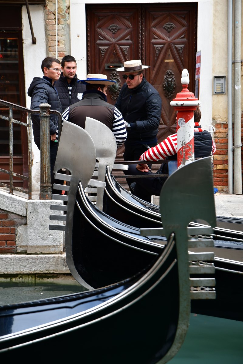 Les gondoliers, autrefois confidents des nobles vénitiens, forment de nos jours une confrérie très fermée où la tradition se perpétue de père en fils. On voit bien sur cette photo le ferro, sorte de peigne de métal qui représente les 6 sestieri de Venise. Le septième, à l'opposé, représente la Giudecca. Le ferro est un élément décoratif dont le poids sert à compenser celui du gondolier.