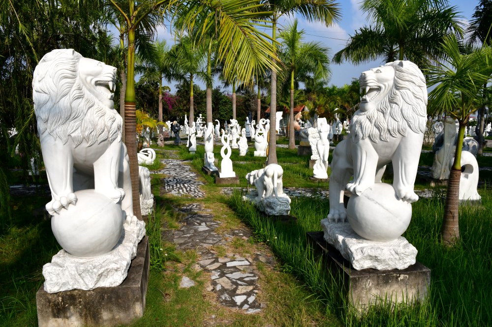 Un grand jardin non loin de la baie d'Halong terrestre ? Non. La région est connue pour la fabrication industrielle d'énormes statues taillées dans le marbre local. L'inspiration est diverse et variée. Tous les goûts, tous les styles, sont représentés et on expédie partout dans le monde. Vous êtes sûr de ne pas vouloir une immense Jeanne d'Arc gardant ses moutons pour votre jardin ?