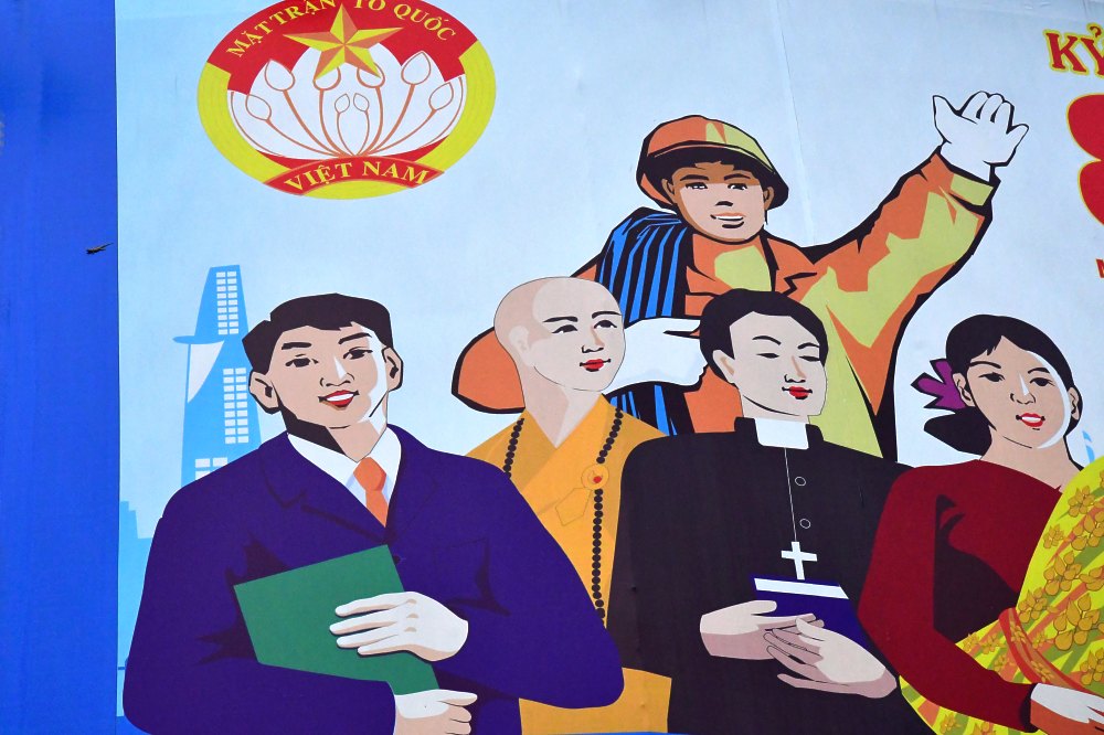 Propagande et religion à Saigon. Un cadre du parti, un bonze, un prêtre, une paysanne et un militaire en tenue camouflée.