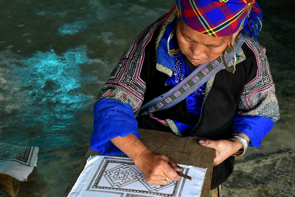 Une commerçante de l'ethnie Hmong brode en attendant les clients.
