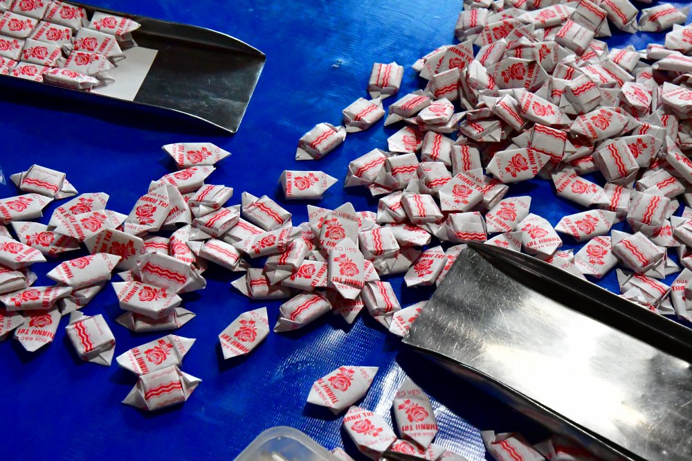 Finalement, nous nous décidons pour quelque chose d'original et que nous pouvons offrir : des caramels au goût de camembert, fabriqués sous nos yeux !