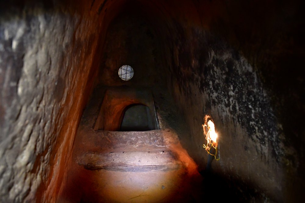 Saut de loup. La taille de l'ampoule (qui n'existait pas à l'époque de la guerre) donne une idée de la taille très réduite du passage.
