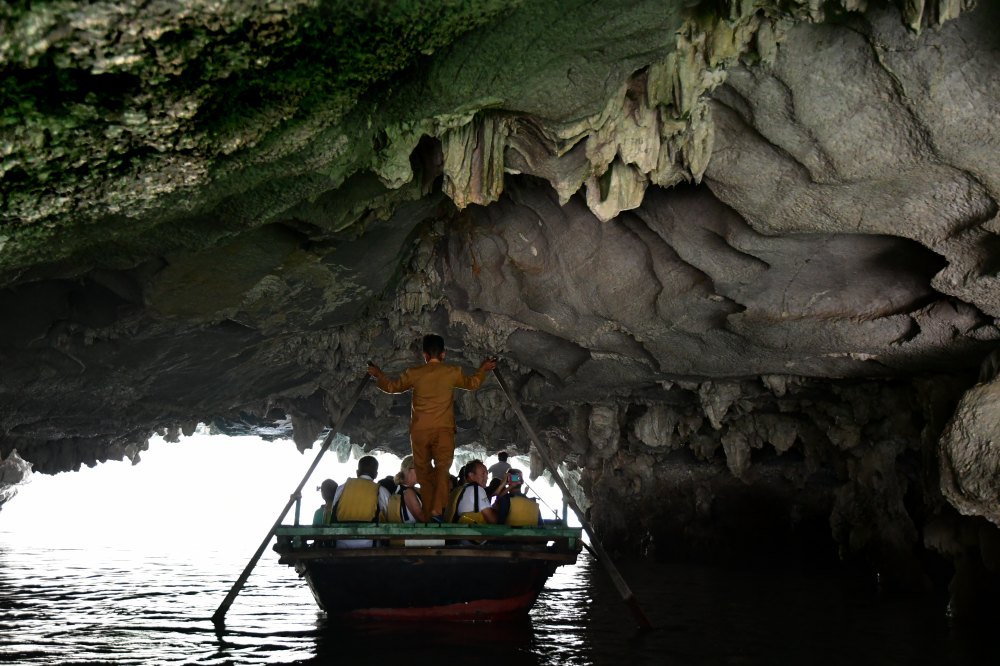 Au niveau de l'eau, une entrée voûtée mène à la grotte, juste à la base de l'île aux parois verticales.