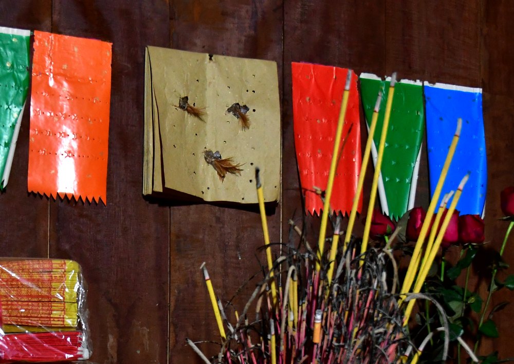 Plumes des coqs sacrifiés au premier mois lunaire et collées avec leur sang au-dessus de l'autel des ancêtres.