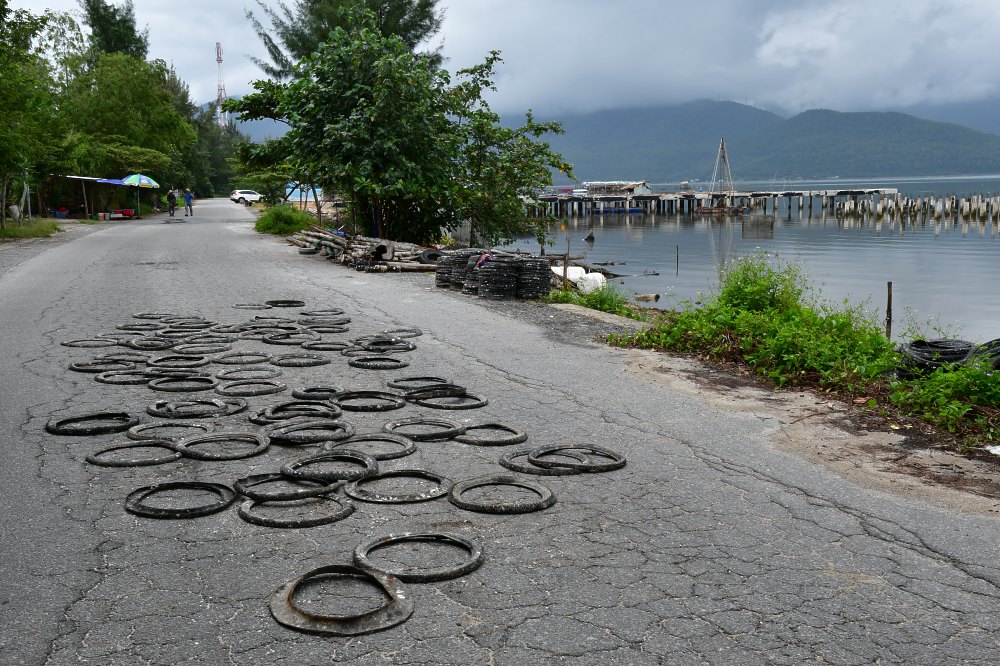 Les vieux pneus de motos nettoyés sèchent sur la route. Ils serviront d'ancrage aux huîtres. Nous sommes ici sur un ancien tronçon de la Route mandarine que n'empruntent pas les camions.