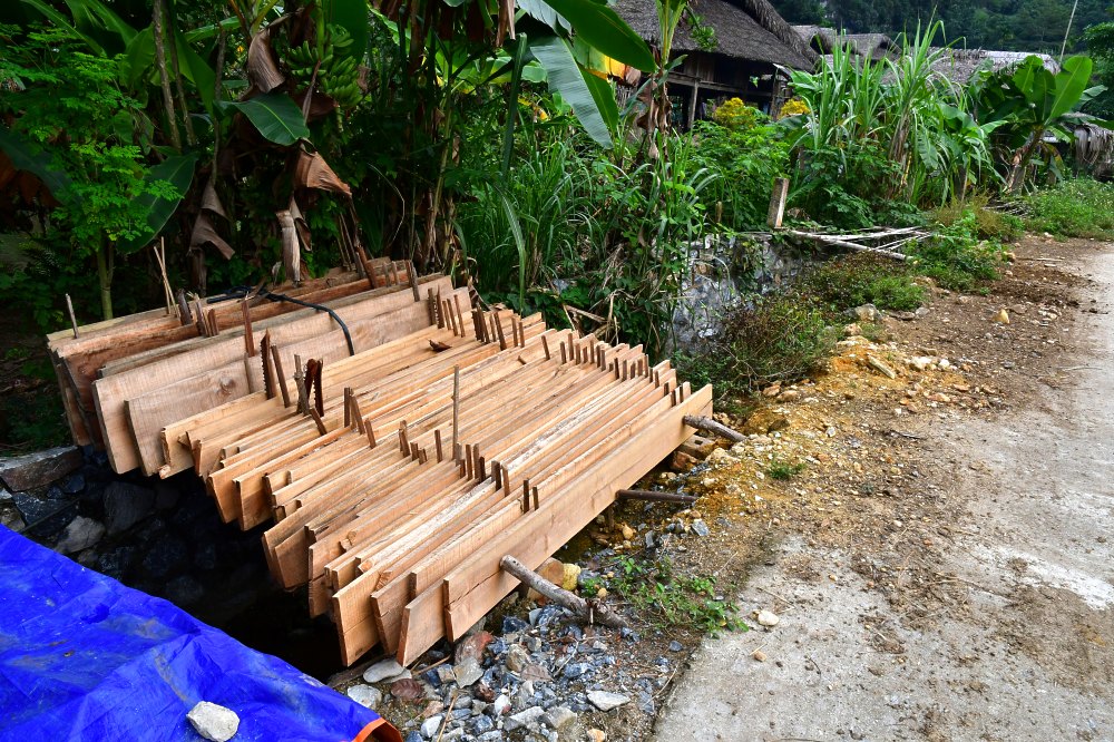 Les planches, après avoir séjourné de long mois dans l'eau pour durcir le bois, sont mises à sécher avant la construction des murs.